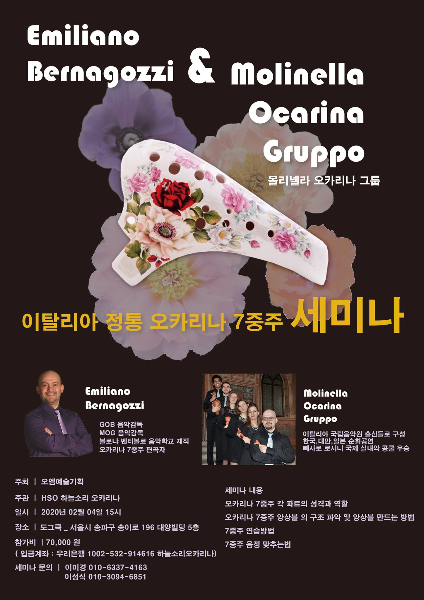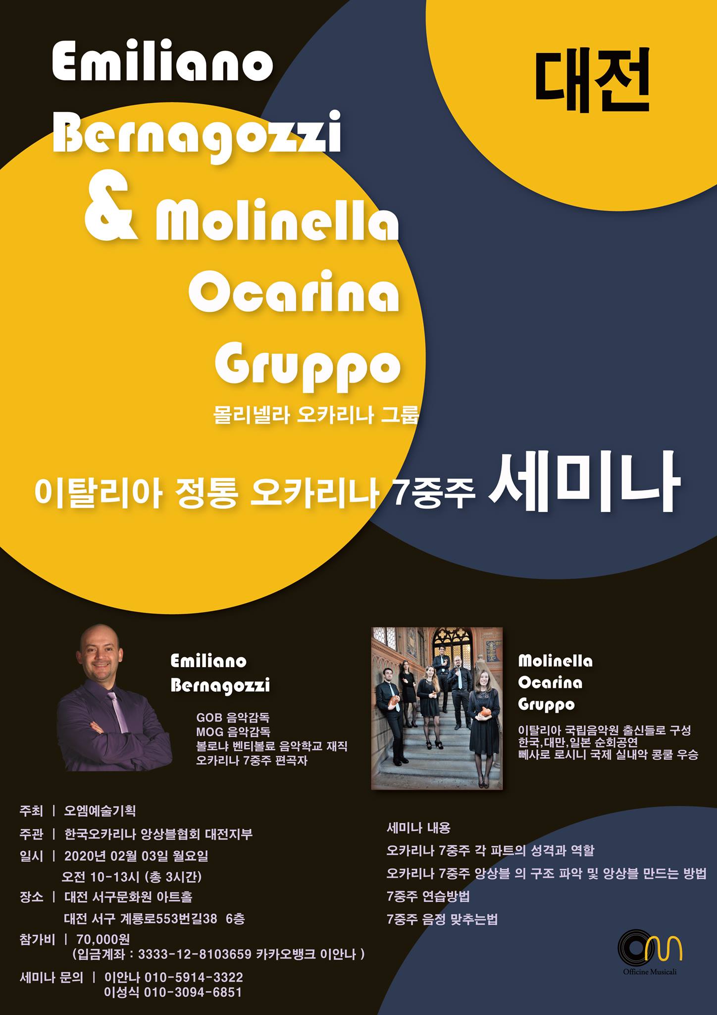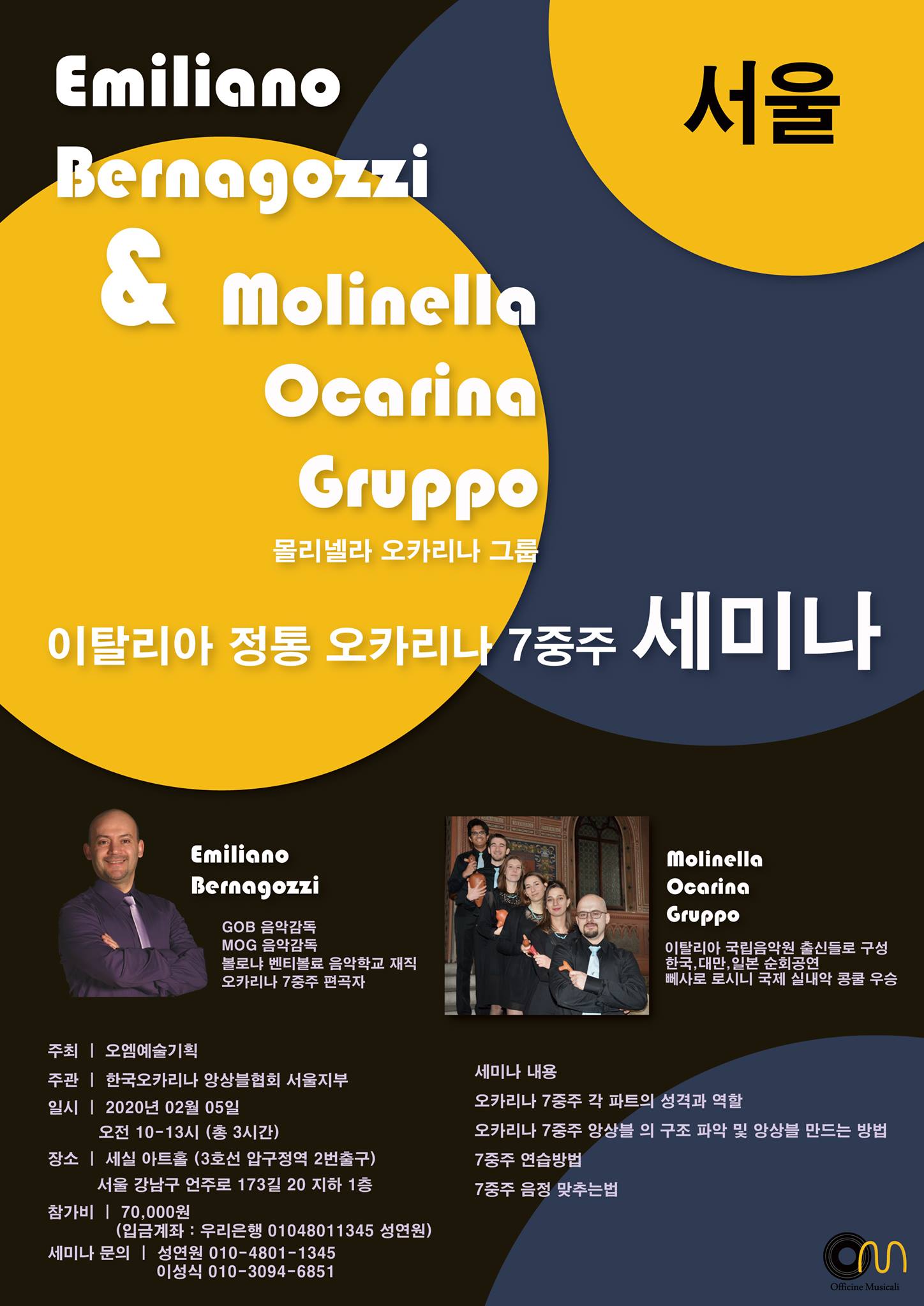 프로젝트의 하나인 오카리나 7중주 세미나를 아래와 같이 진행하려고 합니다.에밀리아노 본인이 편곡한 오카리나 7중주 기초, 중급, 고급 과정을 세계적인 오카리나 7중주 그룹으로 성장한 MOG(Molinella Ocarina Group)의 시연으로 상세하게 설명드립니다.
